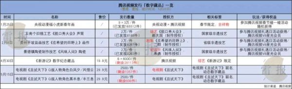 总体来看,腾讯视频目前更多基于平台内容、资源进行数字藏品的创作或发布,如其介绍,腾讯视频数字藏品特点为具有丰富的正版内容和明星周边资源,同时安全合规,获得方式多样。除此之外,传统文化也受到其重视,数字藏品捆绑平台活动或会员的做法也有利于其进行拉新或留存更多用户,平台显示目前有超过20万人参与获得数字藏品,但值得一提的是,其需要通过购买获得的数字藏品的销售情况并不算非常火爆,如“《新游记》”系列发售3.6万件,仅卖出7000多件;热门电视剧《且试天下》的数字藏品共发售5000件,还剩下近一半。
