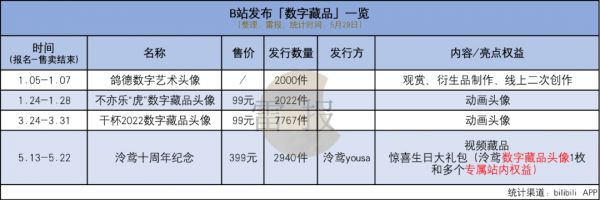 B站的官方数字藏品信息由账号“哔哩哔哩数字藏品”发布,据统计,自1月以来,B站发行了4款数字藏品,除了3款“头像”,还有B站知名虚拟主播“泠鸢yousa”的十周年纪念数字藏品。