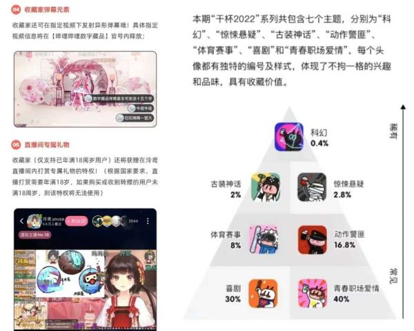 “泠鸢”系列数字藏品除了包含头像,购买该系列数字藏品还能够拥有视频形式的个人空间头图及专属站内权益,如直播间专属礼物,在指定视频下发射异形弹幕,部分藏品还作为泠鸢生日二创活动的奖品空投给到用户,这些举措能够与平台业务联动起来,同时刺激用户互动或创作,除此之外,平台用户还能够为数字藏品点赞,这点小红书也早已实现,B站还为部分数字藏品划分了稀有度。