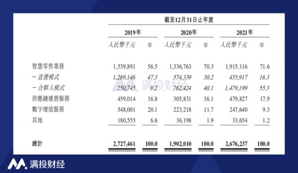 供应链运营服务包括商品批发、机器销售及租赁、提供硬件志愿服务等,收入占比维持在17%左右。数字增值服务主要是利用庞大的点位网络向客户提供数字广告服务,这块业务的毛利率最高,2021年为76.3%,但收入占比却逐年下降,由2019年的20.1%下滑至2021年的9.3%。