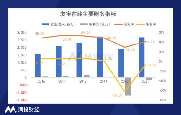 相应地,友宝在线2019年至2021年录得净利润3965万元、-11.84亿元、-1.88亿元,累计两年亏损达13.72亿元。净利率也在2020年由正转负,为-62.3%,盈利能力大降。