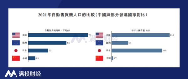 但从市场的渗透率来看,2021年,美国、欧洲及日本分别拥有约730万台、460万台及250万台自动售货机,每千人的拥有量为21.9台、6.1台及20.0台。中国人口众多,2021年中国自动售货机的每千人拥有量仅为0.7,每千人拥有量远低于美国、欧洲及日本等主要发达国家及地区。因此,中国自动售货机零售市场仍有不少增长空间。