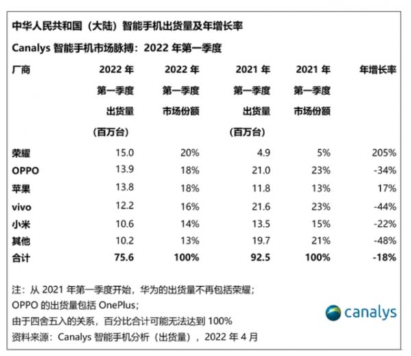 从多家咨询调研机构数据看,2022年第一季度荣耀排在国内手机市场份额前列,Canalys甚至认为荣耀以20%的市场份额,坐上了头把交椅。这意味着,荣耀经历一路下滑到3%的至暗时刻后,完成了漂亮的U字曲线反攻,成功抢下华为留下的市场空白。