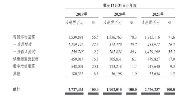 在友宝的营收中,智慧零售服务贡献了大头。智慧零售服务就是友宝通过自动售货机向消费者提供零食、咖啡及其他饮品等产生收益。2019年、2020年及2021年,智慧零售业务给友宝带来了15.4亿元、13.37亿元、19.15亿元的收入,占总营收的比重达到56.5%、70.3%、71.6%。