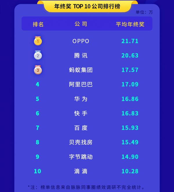 年终奖Top10公司排行榜显示,平均年终奖最高的是OPPO,达到21.71万元;腾讯以20.63万元排名第二,紧随其后的是蚂蚁集团,达到17.57万元。阿里巴巴居然未能进入前三,但也达到17.09万,与蚂蚁集团比较接近。