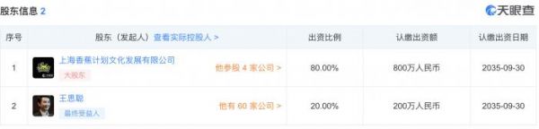 据香蕉影业官网显示,香蕉影业由王思聪于2015年10月在上海注册成立,为上海香蕉计划文化发展有限公司旗下继电子游戏、娱乐演出、体育之后的第四大板块,也是香蕉计划“全产业链、泛娱乐生态”重要一环。2017年8月,前万达影业副总经理韦翔东加盟香蕉影业,担任香蕉影业执行总裁一职。