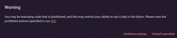 “您正在执行被禁止的代码,这将有可能影响您在未来使用 Colab 的能力。请查阅FAQ页面下专门列出的禁止行为。”