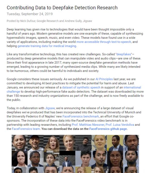这的确不是谷歌第一次出面打击 deepfake 内容制作了。在2019年,Google Research 就发表过一个大型视频数据集。其背后是谷歌在自己内部通过制作 deepfake 视频的方式,从而试图了解相关算法的工作原理。