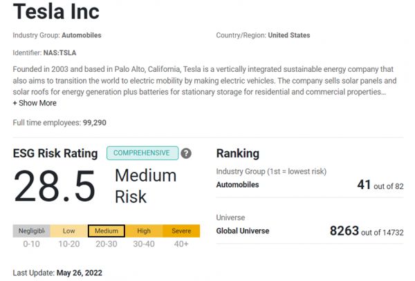 上图是国际权威ESG评级机构Sustainalytics在5月26日对特斯拉的最新ESG评分。可以看到,特斯拉的ESG风险评分为28.5分,处于中等风险区间。在82家参与评级的车企中排名41,在全球14732家参与评级的企业中排名8263,均处于中游水平。