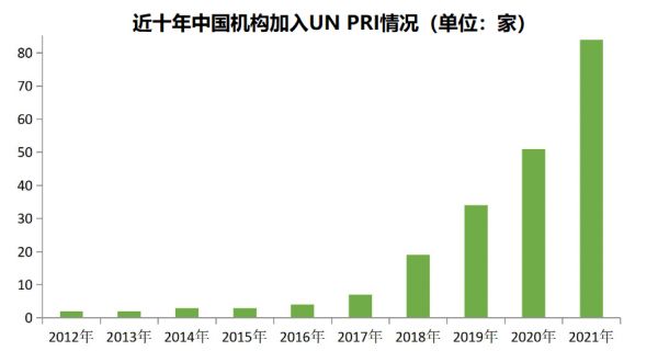 除产品外,机构对于ESG投资策略也愈发重视。负责任投资原则组织(简称 PRI)是联合国在2006年起支持的国际投资者网络,促进签署方将ESG纳入成员投资决策。截至2022年3月15日,中国内地共有93家机构签署PRI,包括4家资产所有者与61家资产管理者,其中公募基金20家,占我国公募基金公司总数的15%。