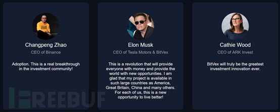 相比之下,这个BitVex加密货币交易平台的官网反而显得更假,在官网介绍中,该平台声称埃隆·马斯克是其首席执行官,并有方舟投资(Ark Invest) CEO凯西•伍德和币安网(Binance) CEO赵长鹏的背书。