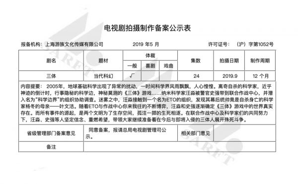 根据备案公示显示,电视剧《三体》将拍摄24集,预计今年9月开始拍摄,制作周期12个月。报备机构为上海游族文化传媒有限公司。游族为《三体》的影视改编权所有方,此前《三体》电影的拍摄正是由这家公司负责的。