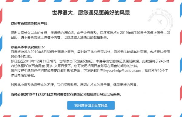百度旅游表示,即日起至2019年12月31日期间,用户可点击下方“我同意导出至百度网盘”授权按钮,申请导出用户的游记及画册数据,相关数据将于24小时内迁移至PC版百度网盘-更多-文章目录下,用户可使用相同百度账号在网盘访问资料。此外,用户还可以邮件形式导出相关资料。