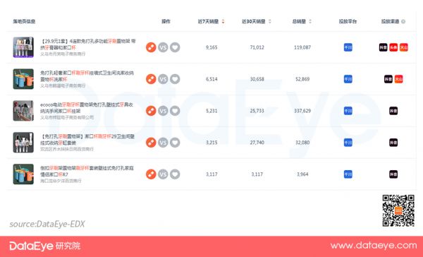 DataEye-EDX ray数据显示,多款牙刷杯近30天销量破万,其产品配置关键词主要为“免打孔”、“置物架”、“4连款”,商家如有选品需求,可着重往这方面考虑。