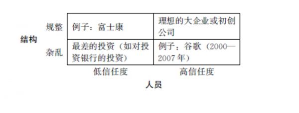 最接近这种状态的是2000—2007年的谷歌,公司中有才能的人可以在各种不同的项目中工作,可以不受太多约束地工作。与这种状态相反的组合——低信任度的人员和规整的结构——有时也可以使公司有效运转,这种组合基本上是极权主义。