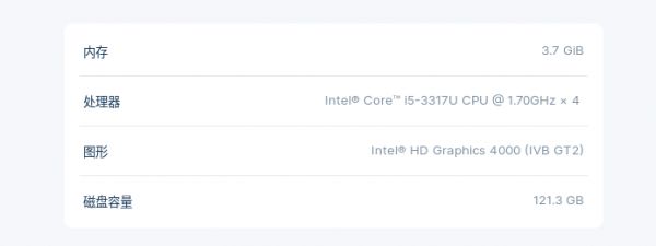 Mid-2012 的这款 MacBook Air 配置不高,我当初没觉得自己会做什么高负载的工作,于是只把硬盘从 64G 提到了 128G。4G 的内存、i5-3317U 的处理器,放在 Windows 阵营也会是一样的迟钝——一台用了快十年的一代 Surface Pro 想必也好不到哪里去,一个 Chrome 都能把内存榨干——而放在 Ubuntu 上,也只是将将满足最低需求。