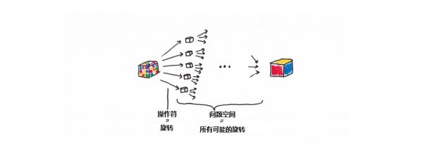 *问题空间就像是魔方的所有可能构型的集合。因为魔方构型有 43 万亿以上的可能性,所以,它的构型空间(也就是问题空间)是巨大的。
