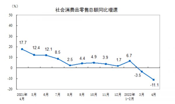 据国家统计局最新发布的社会消费品数据显示,2022年4月,社会消费品零售总额29483亿元,同比下降11.1%。其中,除汽车以外的消费品零售额26916亿元,下降8.4%。从更长的时间维度看,2021年4月到2022年4月,社会消费品零售总额同比增速依旧呈现持续下降状态。