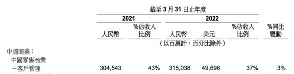 根据阿里公布的财报显示,从2019财年到2022财年,中国零售商业业务中关于客户管理收入的占比从55%降至37%。