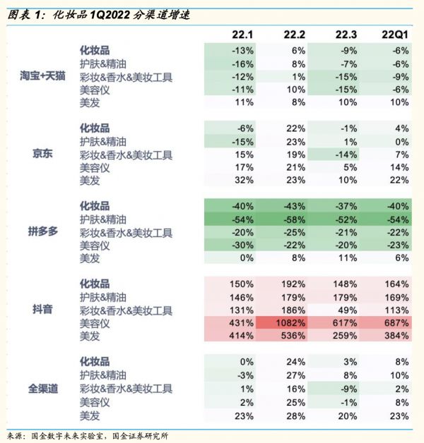 据国金证券今年4月发布的《化妆品电商数据专题分析报告》显示,2022年第一季度化妆品电商GMV为1167亿元,同比增长8%。从渠道占比来看,淘系排名第一占比为54%,但同比下降6%;抖音排名第二占比为23%,同比增长164%。