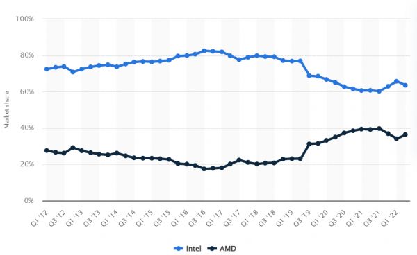 2012 年至 2022 年全球Intel和 AMD X86计算机处理器份额