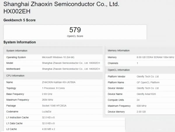 不过最近显卡领域传来了好消息,6月1日晚间,GeekBench 5跑分数据库里出现了一套来自兆芯的台式电脑整机,该机不仅配备了兆芯自研处理器KX-U6780A(8核心8线程/8MB L3/2.7GHz)、兆芯自研主板HX002EH,更配备了一张前所未有的兆芯自研独立显卡!