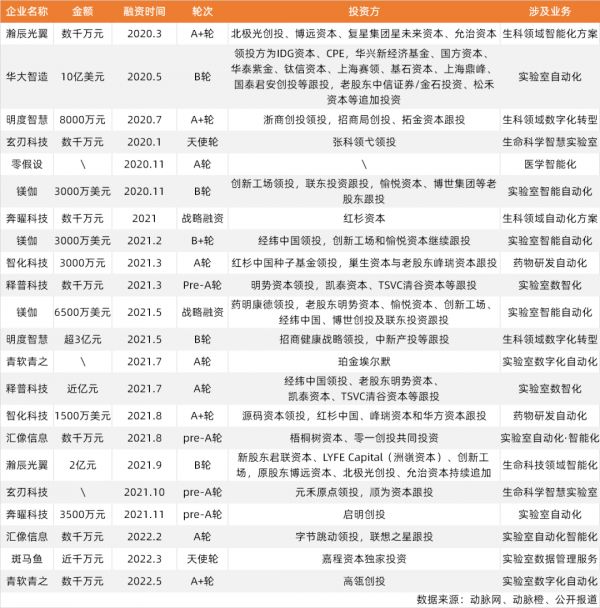 其中,2021年是智慧实验室的活跃期,共发生了13起融资事件,融资金额近14亿元。其中,不乏北极光、创新工场、红杉中国、经纬中国等一线VC的身影。2022年初,高瓴创投、字节跳动完成投资,赶上了智慧实验室这趟列车。