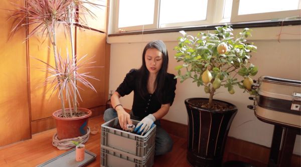 图为苏一格与她的蚯蚓桶。图中的两株植物也都参与了土壤循环