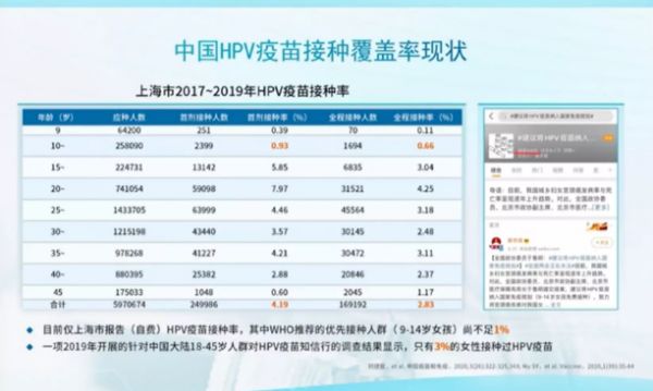 但截至目前,我国HPV疫苗接种覆盖并不高。2019年中国大陆18-45岁人群对HPV疫苗认知行为的调查结果显示,只有3%的女性接种过HPV疫苗。根据目前上海市报告,WHO推荐优先接种的9-14岁女孩的HPV疫苗接种率,尚不足1%。