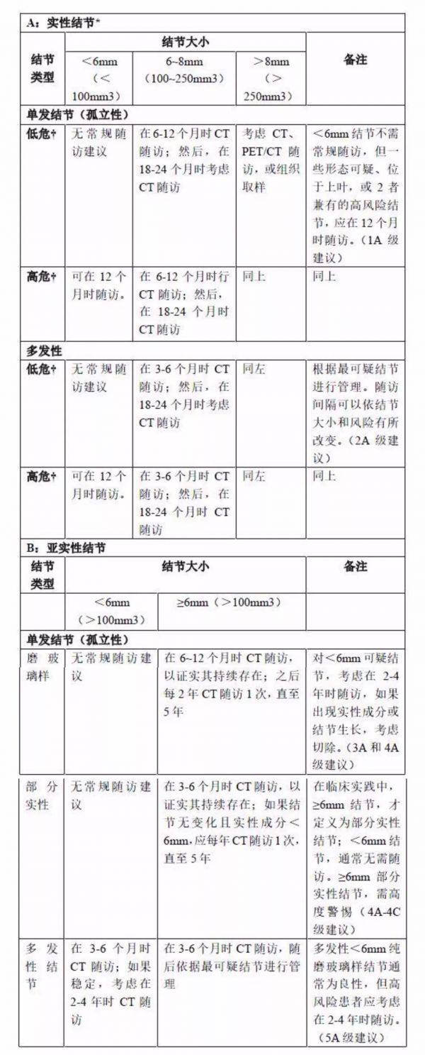 2017 版 Fleischner 指南,针对成年人偶然检出肺结节的管理建议▼