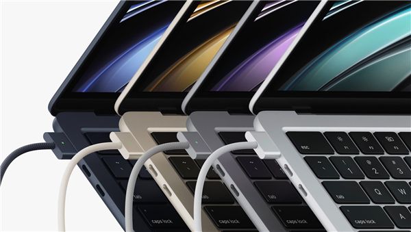 硬件方面,新款MacBook Air笔记本首发M2处理器,最高可选8核CPU及10核GPU,还有24GB内存及2TB硬盘。值得一提的是,这次MacBook Air将经典的MagSafe接口带了回来,最高支持67W快充,续航时间长达18小时,半小时即可充入50%电量。