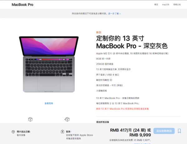 既然模具没变,那么价格自然相对美丽一些。目前新款MacBook Pro 13已经登陆国行商店,入门款(8核CPU/10核GPU,8+256GB)版本售价9999元,标准款(8核CPU/10核GPU,8+512GB)版本售价11499元,每增加8GB内存需要加1500元,每增加512GB硬盘需要1500元。