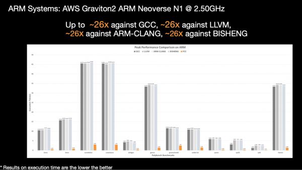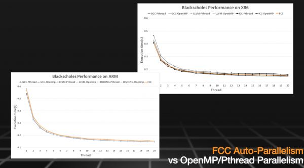 今年3月,清醒异构已发布原型产品Fiuggi Compiler Collection 0.6 (FCC 0.6)。从目前发布结果来看,在x86与ARM架构下使用国际公认的多线程评测程序集PARSEC3.0中的Blackscholes性能对比,FCC自动并行性能已经在这一场景下完全达到手工并行编程的水平。