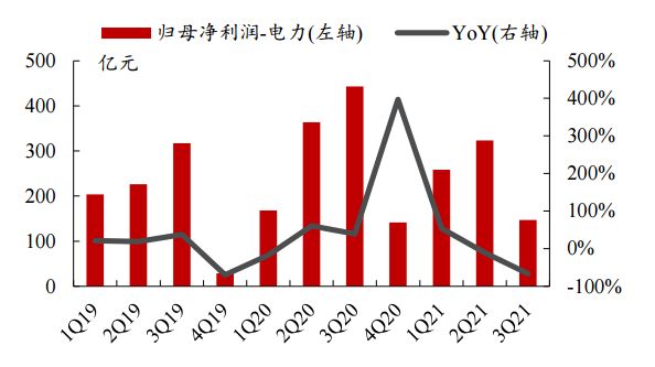 图:2021年以来电力行业归母净利润持续下降;资料来源:Wind,民生证券