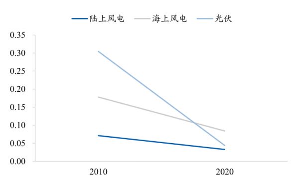 由于传统火电发电技术已经成熟,其发电成本几乎不存在下降空间。相反,风电、光伏由于技术仍处在快速进步阶段,因此项目的造价还在持续下降。根据IRENA的统计,过去十年间中国陆上、海上风电的平均度电成本分别下降了54%和53%,光伏度电成本的下降幅度更是达到86%。2021年新建陆上风电和光伏项目均执行当地省份煤电基准电价,实现全面平价。