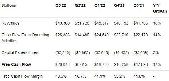 在 22 财年第三季度,微软在一个季度内产生了 20.0B 美元的自由现金流,收入为 49.4B 美元,计算得出的 FCF 利润率为 40.6%。