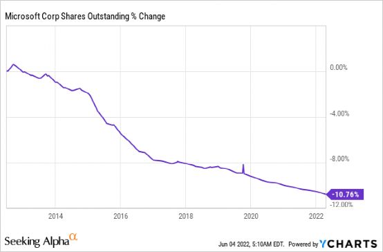 微软一直在市场上回购股票,从股东的角度来看,该公司今年估值的下降使得股票回购更具吸引力。微软在过去十年中已将流通股数量减少了 10% 以上,该公司可能会在 2023 年回购更多股票。