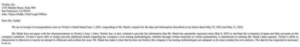 就在几天前,在马斯克团队给 Twitter 首席法务官 Vijaya Gadde 并提交给美国证券交易委员会的一封信中。马斯克方认为, Twitter 不仅一直拒绝向马斯克提供他一再要求的,那些用以帮助他评估 Twitter 平台上垃圾邮件和虚假账户的信息。