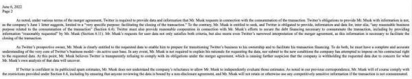 信中还提到,根据合并协议的各种条款, Twitter 必须提供马斯克要求的与完成交易有关的数据和信息。而作为 Twitter 的「潜在所有者」,马斯克显然有权获得所要求的数据,让他能够对业务移交所有权有所准备,并促进他的交易融资。