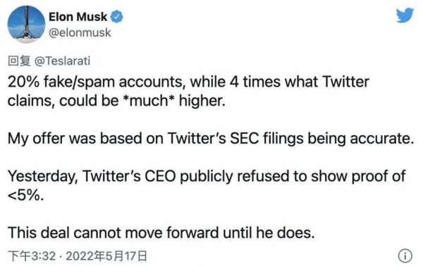 然而,马斯克对这些解释并不满意,还在自己的账号「隔空回复」道:在 Twitter CEO 出示 证明(垃圾邮件以及虚假账户) <5% 的证据前,交易无法继续推进。