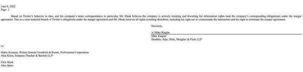 更重要的是,这封信的最后还有这么一段:根据 Twitter 迄今为止的行为,马斯克认为,该公司正在抵制和阻挠他在合并协议下的信息权利。这明显严重违反了 Twitter 在合并协议中的义务,马斯克保留由此产生的所有权利,包括他不完成交易的权利和终止合并协议的权利。