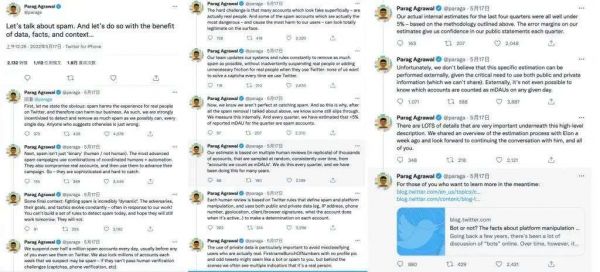 在 5 月宣布因需要等待 Twitter 提供有关数据,以确认其垃圾邮件以及虚假账户的占比不足 5% 后,马斯克决定暂缓对 Twitter 的收购案。之后 Twitter 的 CEO Parag Agrawal 在自己的账号上进行了多次发言,试图解决马斯克的担忧。