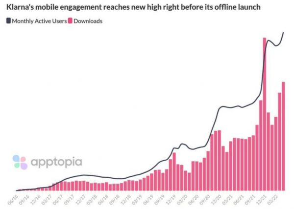 以 BNPL 市场上最头部的玩家 Klarna 为例,虽然在裁员瘦身,但根据 apptopia 近期的数据显示,今年5月份 Klarna 的月活总量创下了有史以来的最高纪录。
