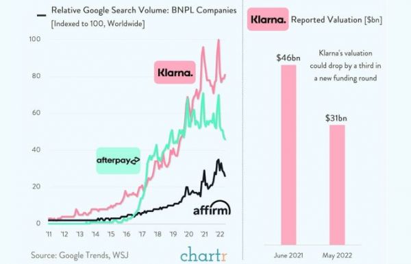 在 WWDC 发布会上苹果官宣 Apple Pay Later 之后,美国版花呗 Affirm 的股价应声走低,截至美股收盘,Affirm 跌超 5%。而据华尔街见闻的报道,今年以来 Affirm 的股价已经下降了 75%。而 Affirm 的竞对 Klarna 近来状况也不好,虽然在 5 月月活创下新高,但是最近却传出估值缩水的消息,据悉去年以 460 亿美金估值拿到软银 6.4 亿美金融资的 Klarna,今年的估值缩水 30%,估值只剩 300 亿美金。