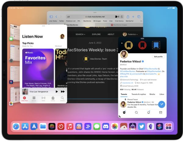 今年 WWDC 上,苹果推出了「台前调度」功能。用户可以将数个应用窗口「捆绑」在一起,固定在屏幕右边,并在不同的「应用群」之间互相切换。iPadOS 和 macOS 均搭载了这一功能,交互逻辑也完全一致。