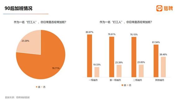 猎聘《当代年轻职场人现状洞察报告》的调研数据显示,76.71%的90后职场人日常经常加班。在北京、上海这样的一线城市里,经常加班的90后职场人占比超80%。