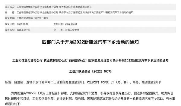 5月31日,工业和信息化部联合商务部、农业农村部、国家能源局发布的《关于开展2022新能源汽车下乡活动的通知》(以下简称《通知》)明确,5月~12月,四部门将联合组织开展新一轮新能源汽车下乡活动,在山西、吉林、江苏、浙江、河南、山东、湖北、湖南、海南、四川、甘肃等地,选择三四线城市、县区举办若干场专场、巡展、企业活动。