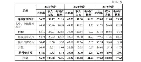 2019年,微源半导体的电池管理芯片毛利率仅为41.71%,而后逐年上升到2021年的64.39%超过微源半导体的平均毛利率56.26%,是所有产品中毛利率最高的产品。