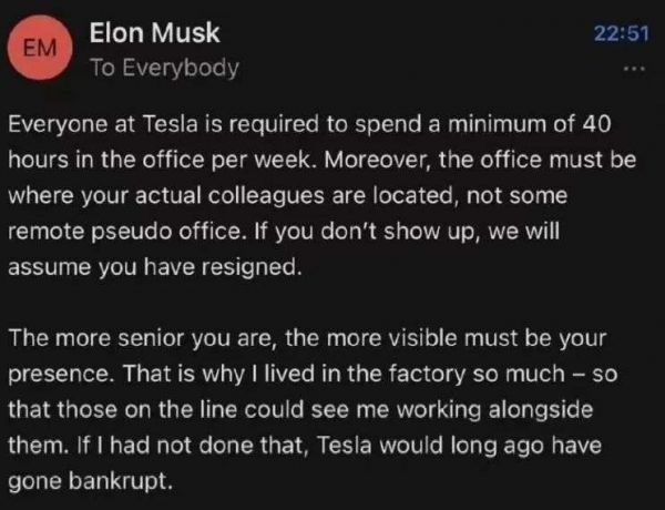 但规律也有反例。比如万亿市值的特斯拉毫无疑问是一家一流企业,但如今他们的CEO马斯克正在抓考勤。6月1日,马斯克通过内部邮件发布通知,要求员工尽快结束居家办公,回办公室上班,且每周必须在办公室待够40个小时。他的口气颇为严厉:“如果你不来,我们就认为你已经辞职了。”