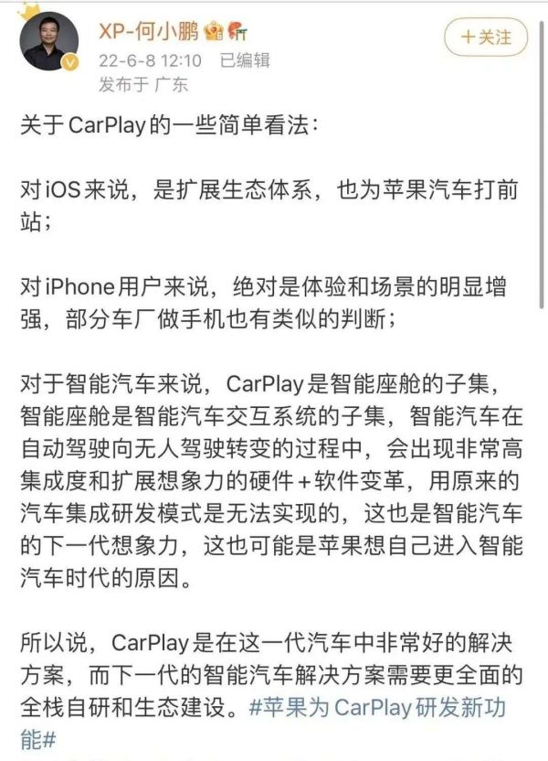 关于这一点,小鹏汽车创始人何小鹏 6 月 8 日在微博里说,CarPlay 是智能座舱的子集,智能座舱是智能汽车交互系统的子集,智能汽车在自动驾驶向无人驾驶转变的过程中,会出现非常高集成度和扩展想象力的硬件 + 软件变革,「用原来的汽车集成研发模式是无法实现的」。